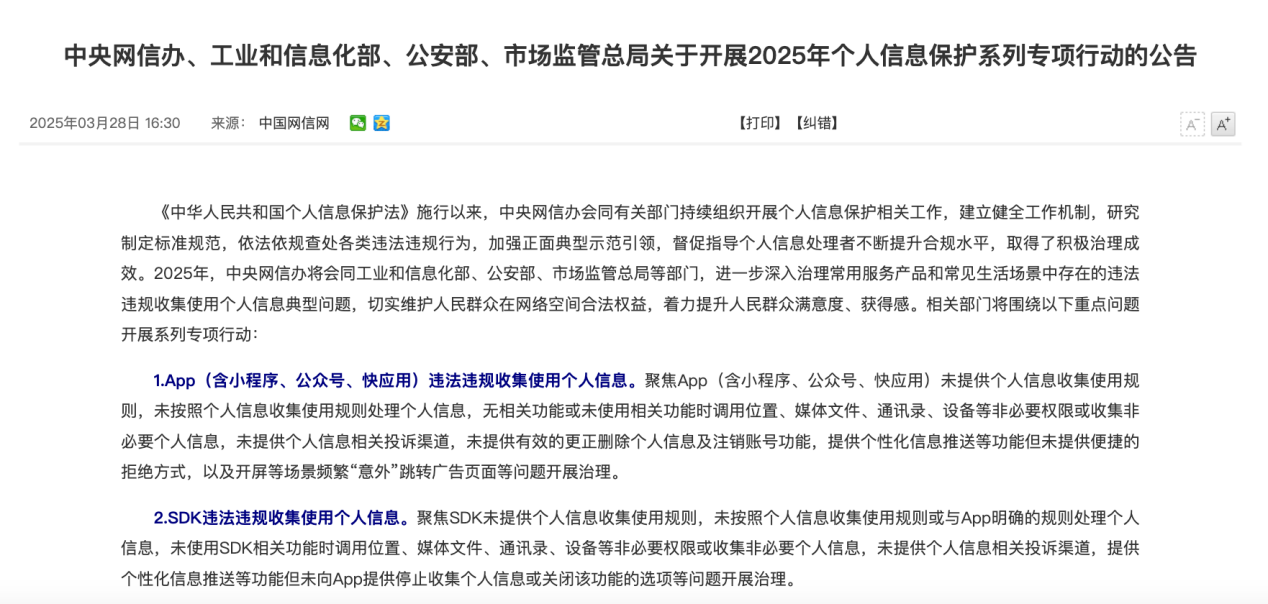 公告指出,相关部门将围绕App(含小程序、公众号、快应用)违法违规收集使用个人信息、SDK违法违规收集使用个人信息、智能终端违法违规收集使用个人信息、公共场所违法违规收集使用人脸识别信息、线下消费场景违法违规收集使用个人信息、个人信息相关违法犯罪案件等重点问题开展系列专项行动。