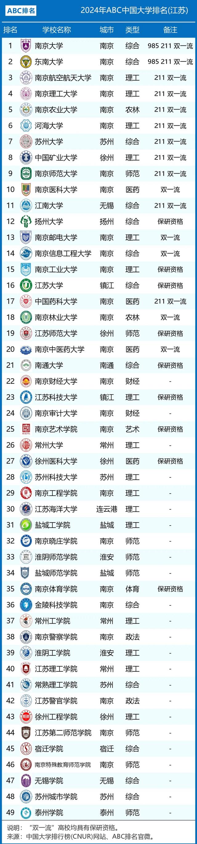 今天,来了解一下2024年我国江苏省大学的排名情况,进入2024年后,江苏省大学排名再度洗牌。