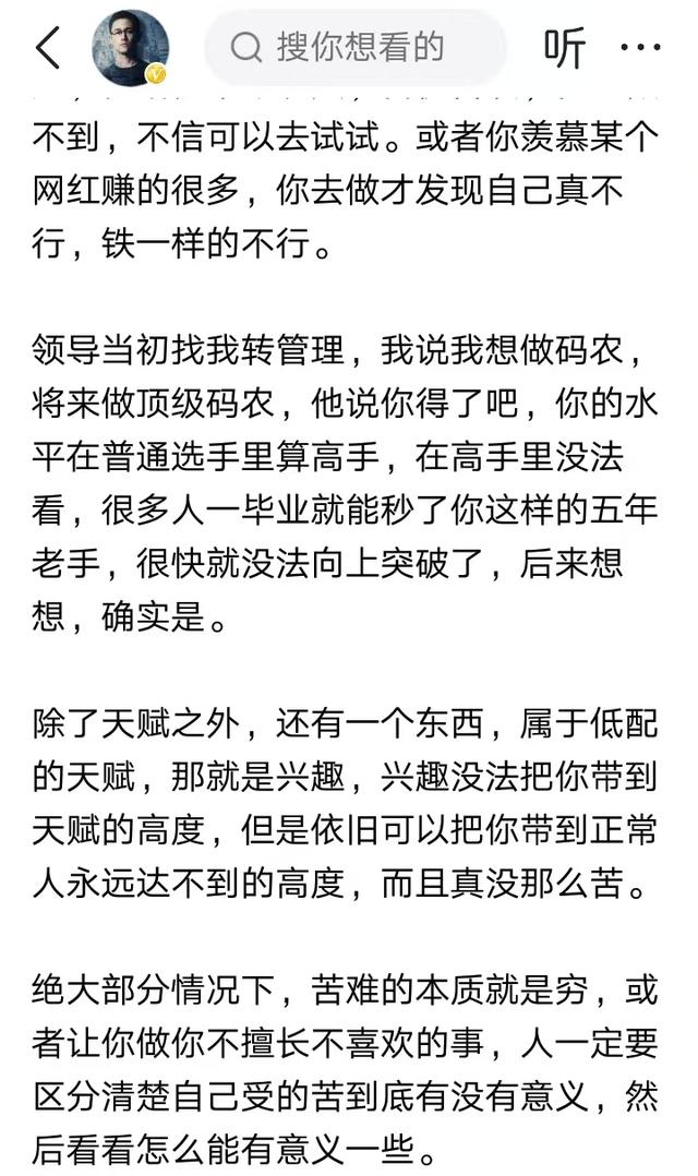 所以苦难的本质就是因为穷,或者干自己没有兴趣的工作,所以你想生活过的好,以后就要干自己有兴趣的事。