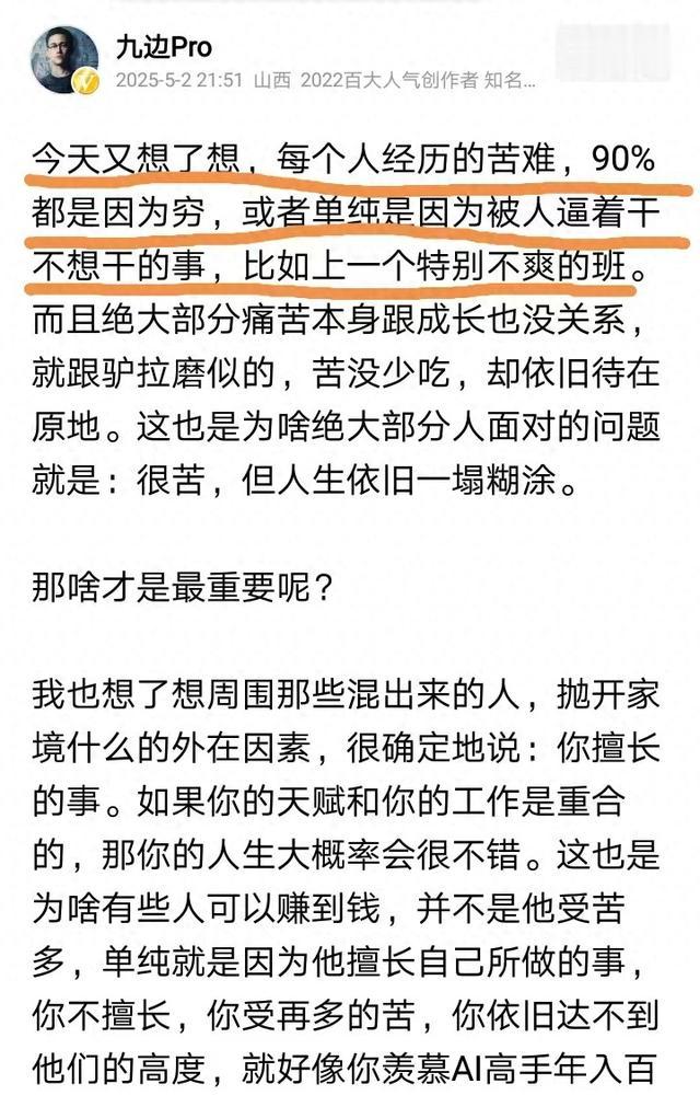 九边说,年龄越大越能感受人生的真谛,想想你这辈子经历的苦难,百分之九十是因为你穷,而不是你不努力不上进。