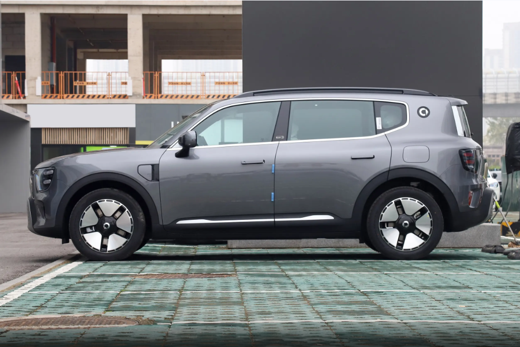 车身侧面来看,smart精灵#5 EHD超级电混整体造型采用了较为标准化的SUV车身架构,整体boxy方盒造型的设计理念,让整车看上去更加沉稳。腰线贯穿车身至尾部,前翼子板上镶嵌了摄像头,C柱位置内嵌了smart的圆形LOGO,车门采用隐藏式门把手,轮圈为半封闭式的五辐设计还配备了无边框车门设计,整体造型搭配有助于减小风阻。