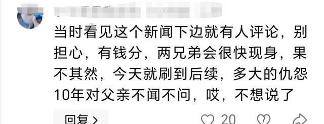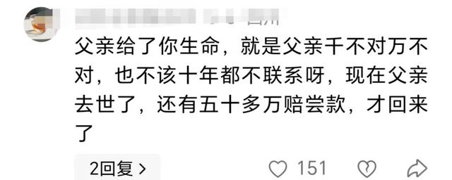 网友的质疑虽说刻薄,却也不全是瞎猜,十年不闻不问,父亲刚走,赔偿金一出,儿子就到了。