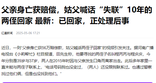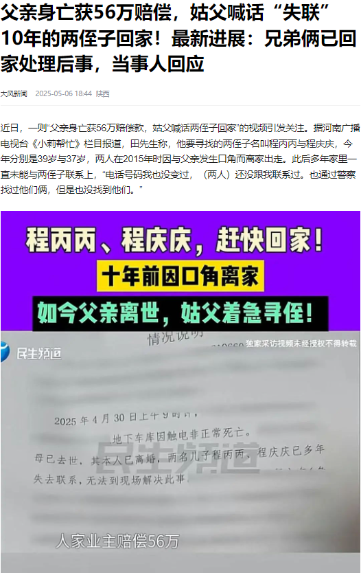 父亲身亡获56万赔偿,姑父喊话“失联”10年的两侄子回家!最新进展:兄弟俩已回家处理后事,当事人回应