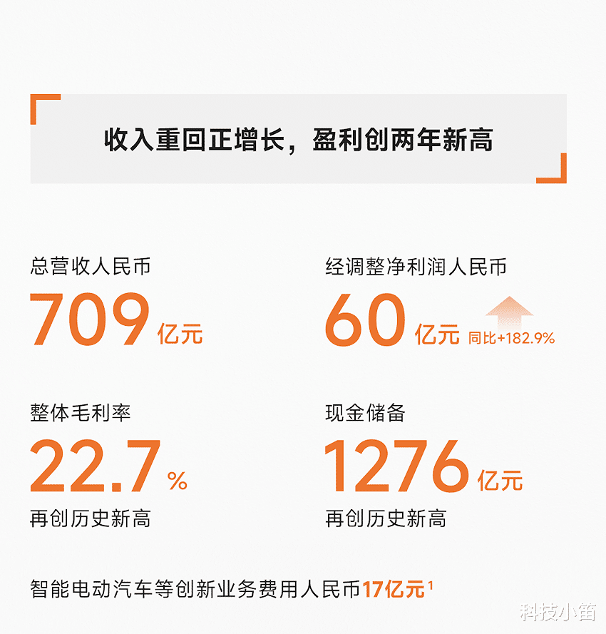 就在近期,小米公布了2023年第三季度财报业绩,堪称“炸裂”。数据显示,小米Q3总营收达到了709亿元,这是小米集团六个季度后单季收入首次实现同比增长。同时,经调整净利润达到60亿元,同比增长了182.9%,创下了近两年来的新高。集团的毛利率也再创新高,达到了22.7%。