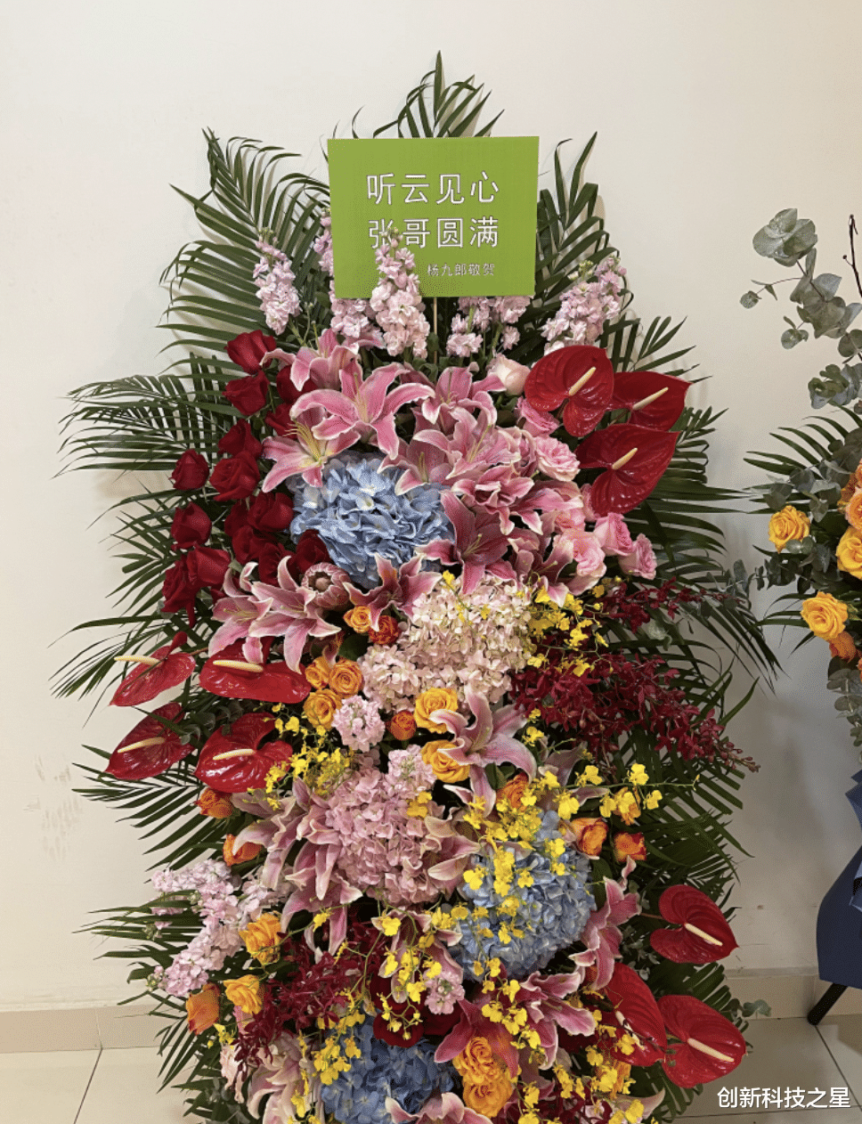 他的好搭档杨九郎还送了个大花篮为他造势。