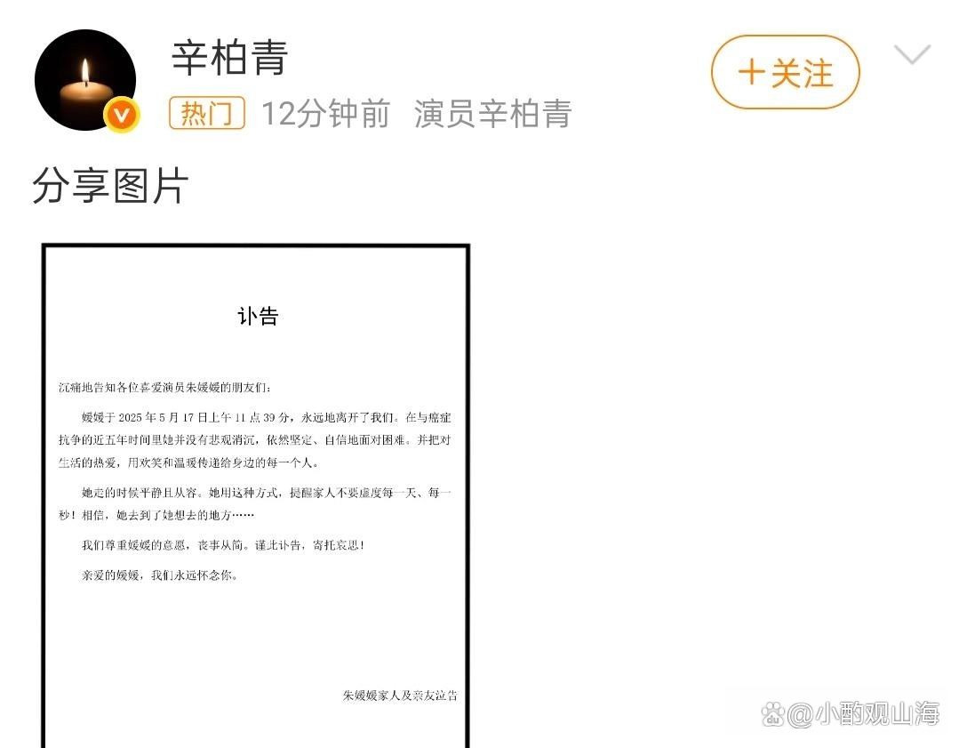 2025年5月21日凌晨,演员辛柏青的微博头像突然切换成黑白色剧场侧影,随后一则讣告让全网泪崩——其妻朱媛媛于5月17日因癌症离世,年仅51岁。这位抗癌五年仍坚持拍摄7部作品的“戏骨”,在遗作《造城者》杀青仅20天后,永远告别了她深爱的舞台。