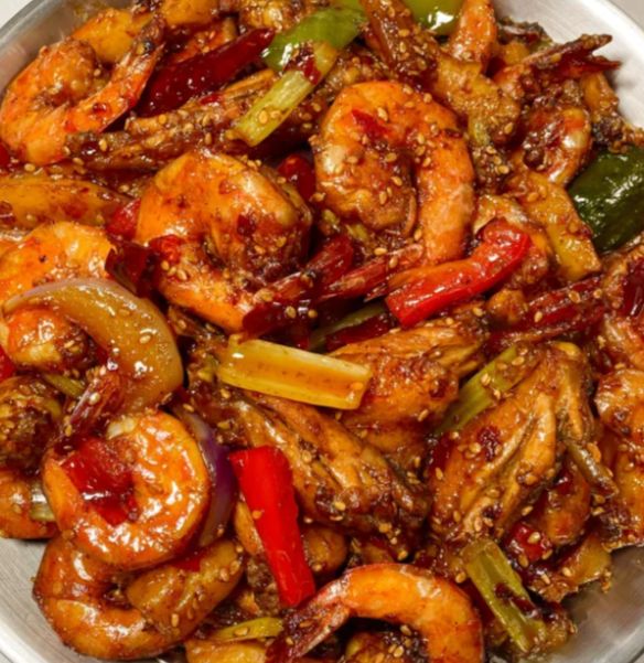 锅不用洗,直接爆香姜蒜,然后加一勺豆瓣酱炒出红油,这是整锅味道的底子。倒入煎好的鸡翅,加料酒、生抽、老抽、蚝油和白糖,翻炒均匀后倒入没过食材的热水。这时候把土豆块和玉米段放进去,盖上锅盖焖煮十五分钟。等土豆能用筷子轻松穿透,就把煎过的虾铺在最上面,再焖两三分钟,让虾吸收汤汁的味道。出锅前撒上一把葱花,锅里的热气把葱香一下子激出来。