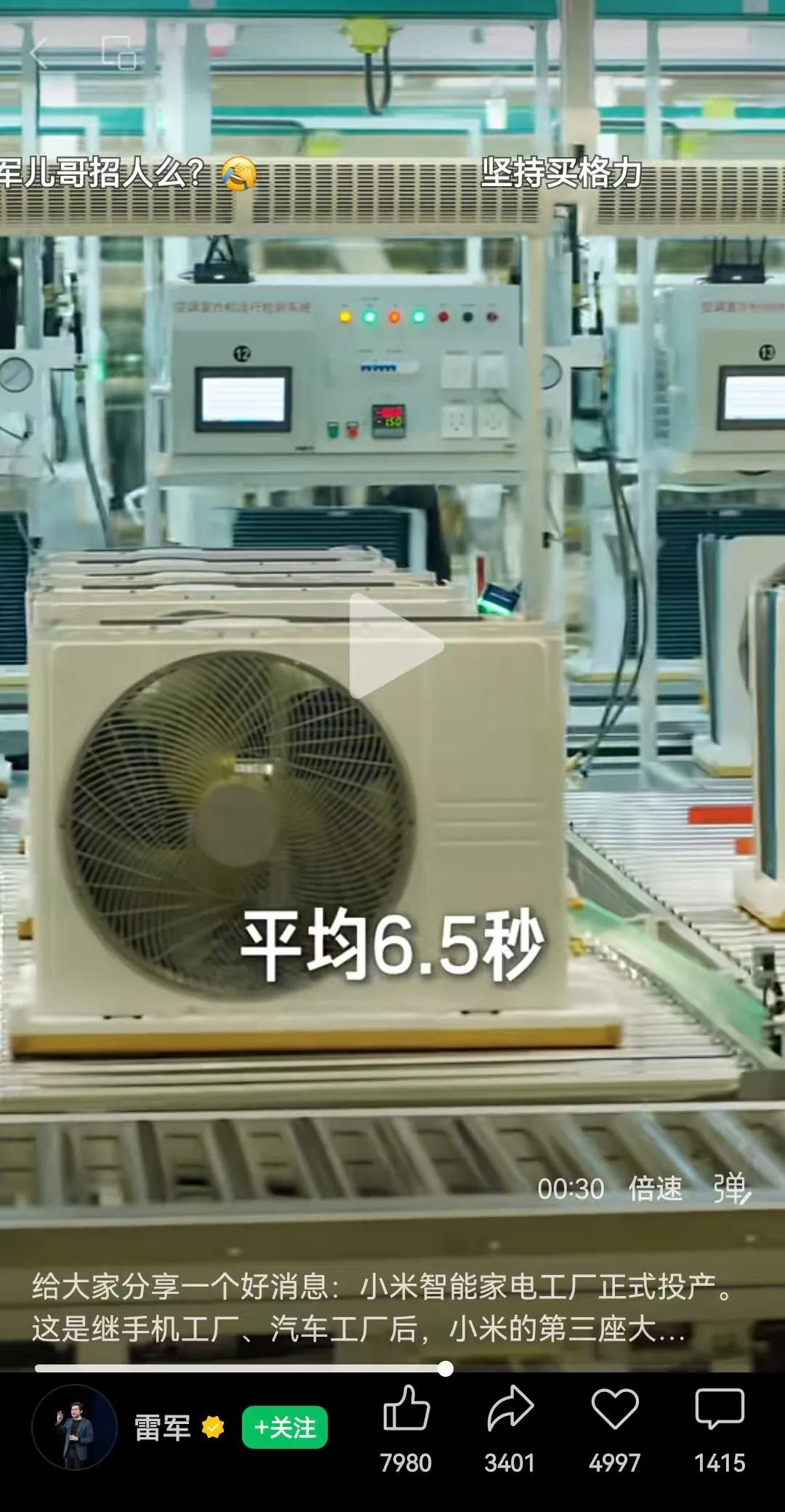 《雷军现身小米家电工厂,总投资25亿,6.5秒下线一台空调》
