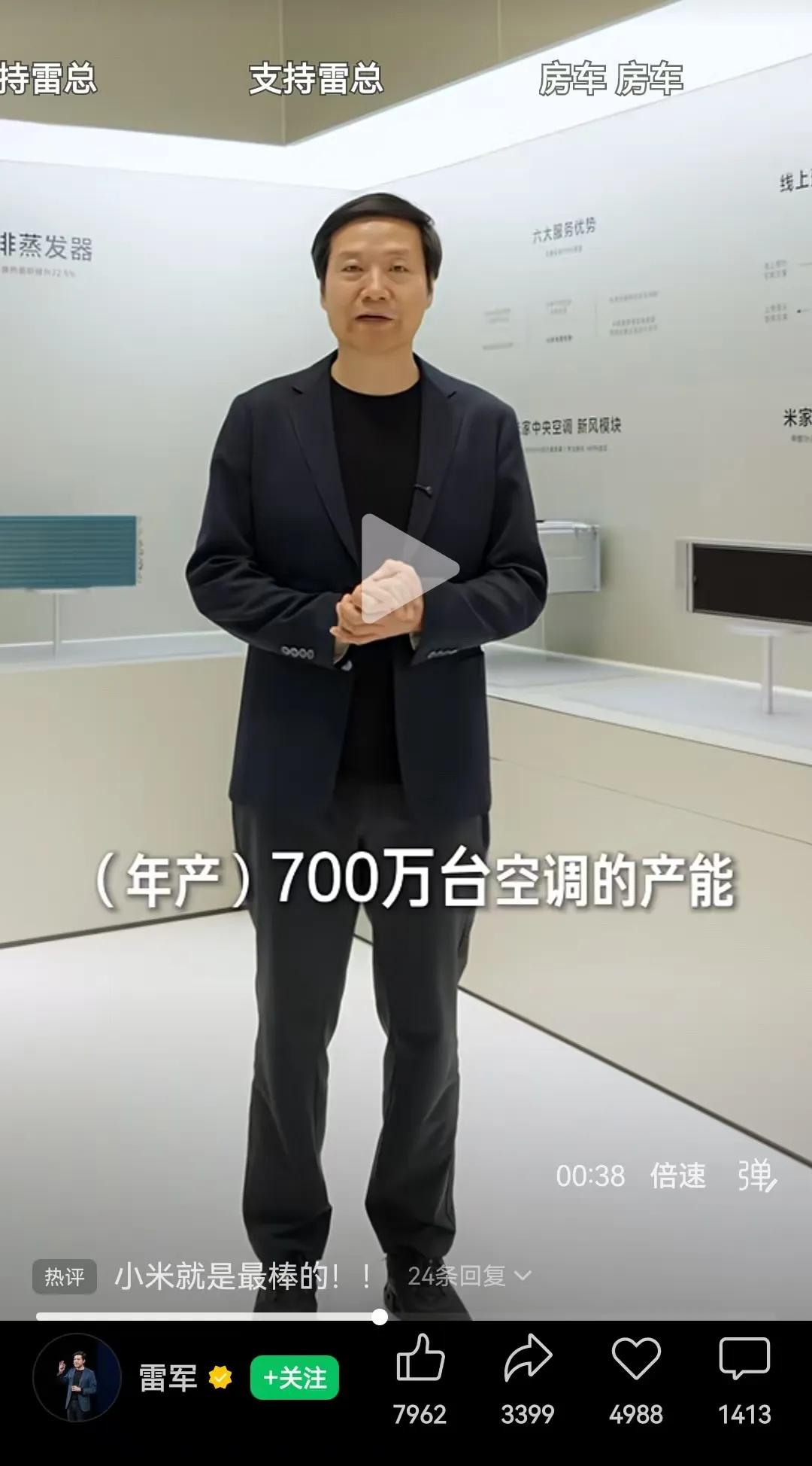 雷军在个人微信视频号说,小米智能家电武汉工厂满产之后——