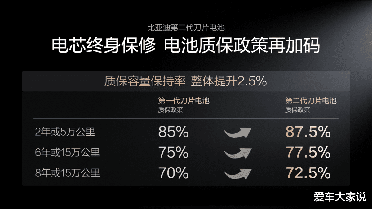 6年或15万公里周期内电池容量保持率标准提升至77.5%,容量不达标可免费包换,且电芯终身保修。