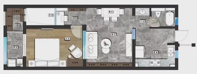 设计师将户型调整了一下,大门入口的玄关改成了家用厨房跟卫生间的干区,那样回到家就可以把蔬菜放在灶台,和客餐厅之间用玻璃来作为隔断,地面铺贴文艺的六边砖,灰与白的结合带来轻松、惬意的感觉。