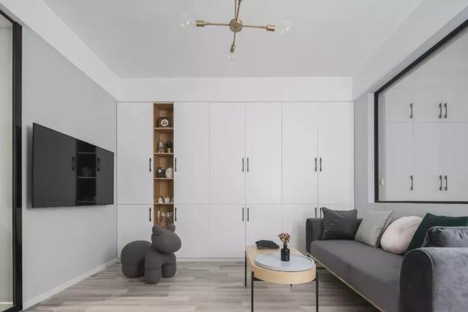 客厅位于餐厅的另一侧,迷你的茶几让空间更显宽敞。在客厅的一侧做上了嵌入式的到顶柜子,给这个小窝增添了不少的储物空间。