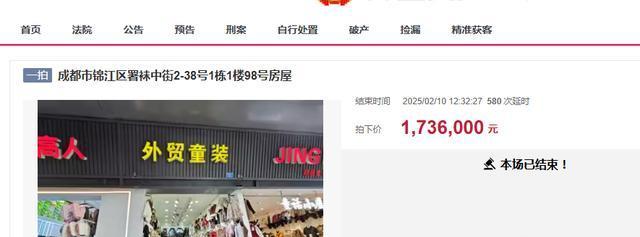 2月11日,阿里拍卖平台上,位于成都市锦江区署袜中街2 - 38号1栋1楼98号的一间房屋进入被拍卖的最后一日竞拍环节。此次拍卖的是一间商铺,其地处春熙路商圈,所在大楼临近成都中环广场,周边还有九龙广场、壹购潮流广场、尚都广场、劲浪体育金开运动中心等场所。