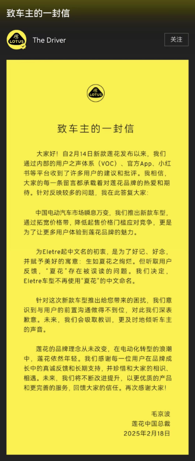 加之今年2月新款ELETRE车型因降价超10万元引发老车主不满。在这种情况下,莲花方面发信致歉。但是,这能否平息老车主的不满,值得考虑。