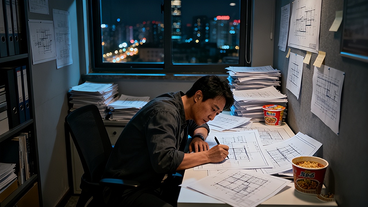 我每天早上六点就起床,晚上十二点以后才睡觉。白天跑建材市场,找客户,谈业务,晚上就在租来的小办公室里画设计图,做预算。