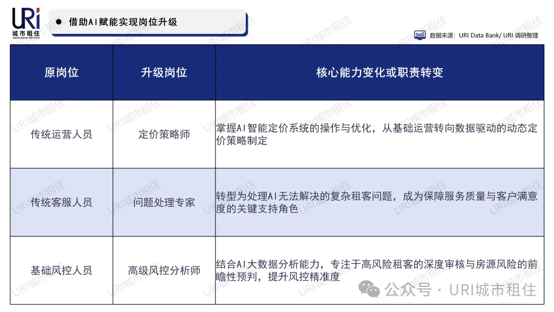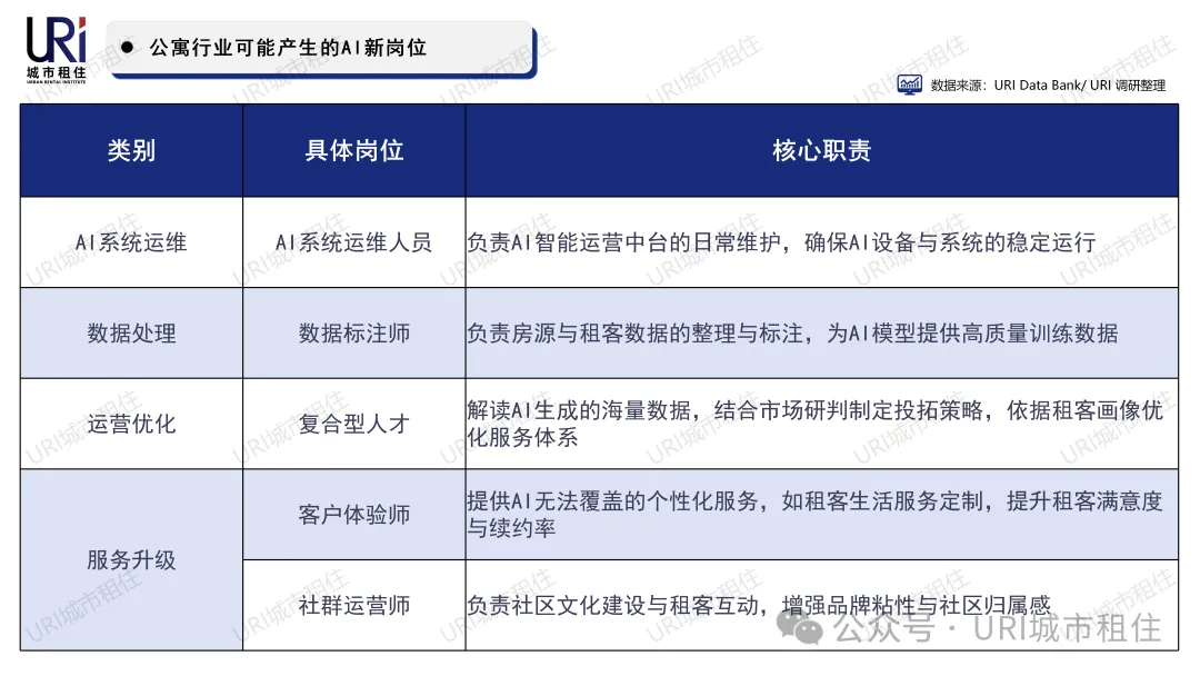 URI城市租住总结了几大类有极大需求的新岗位,主要集中在“AI+公寓”的交叉领域,既需要掌握AI技术应用能力,又需要熟悉公寓行业运营逻辑,成为行业新的就业增长点:
