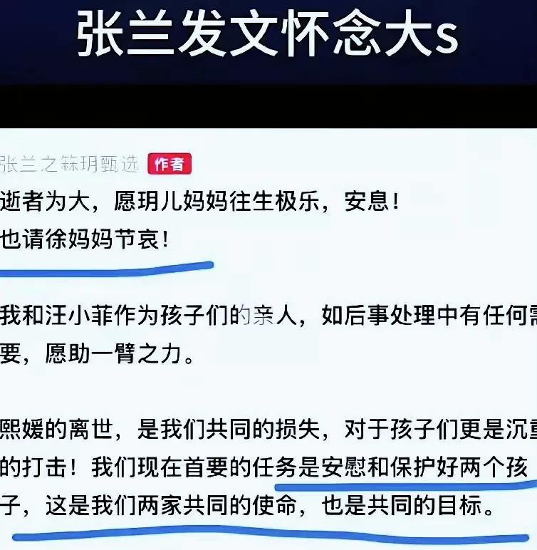 相比于S妈的情感宣泄,张兰和马筱梅的回应显得格外冷静。张兰在社交平台上发文悼念大S,强调“逝者为大”,并呼吁S妈节哀。她的言辞中没有指责,也没有对抗,只是用一种平和的方式表达了对逝者的尊重。