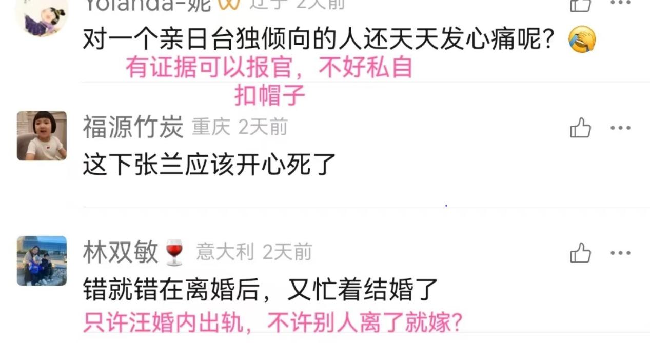 那么问题来了,这些搞两岸民族对立的账号和言论,纯粹是好坏不分的所谓爱国良民所为,还是张兰母子暗箱操作的水军?或许,只有张兰和汪小菲母子才知道了。