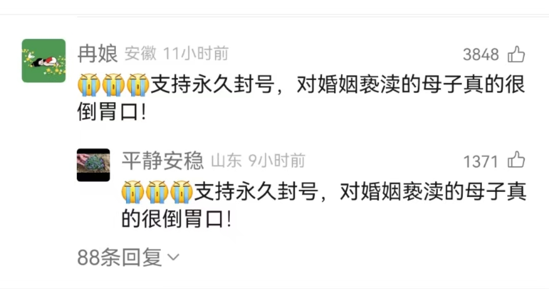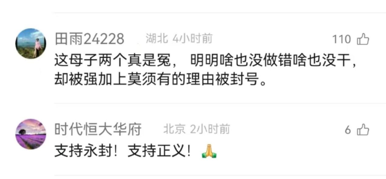 另一派别则鸣不平:“这对母子太冤了!大S与汪小菲离婚了,前婆婆和汪小菲什么事,封禁账号太过分。”