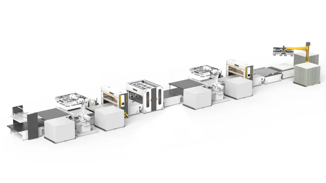 ✓ 从机器人上料、喷胶、复合、翻转、输送到压机压合,100%机器人自主作业,全程自动化、无人化。
