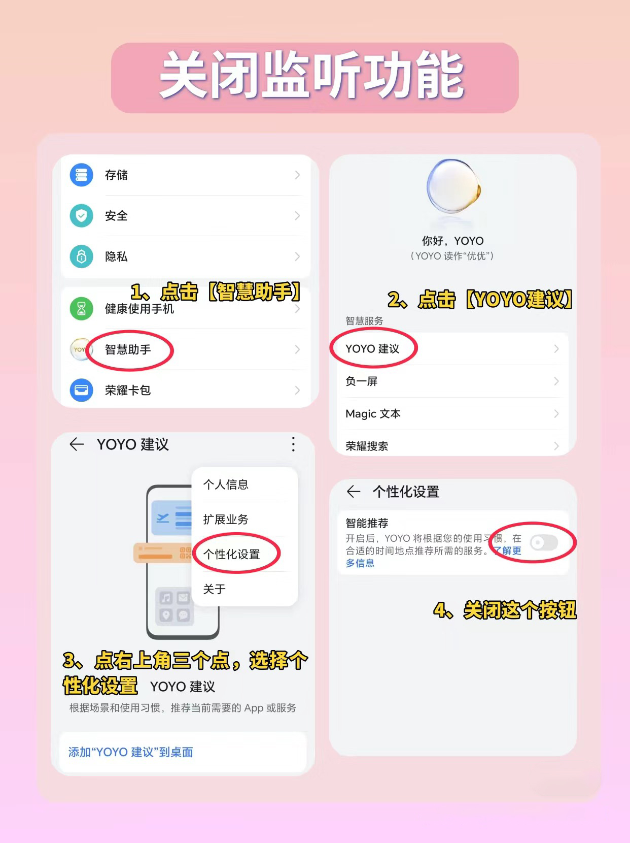 通过【设置】—>【智慧助手】进入【YOYO建议】点击右上角三个点进入【个性化设置】将【智能推荐】的开关关闭。