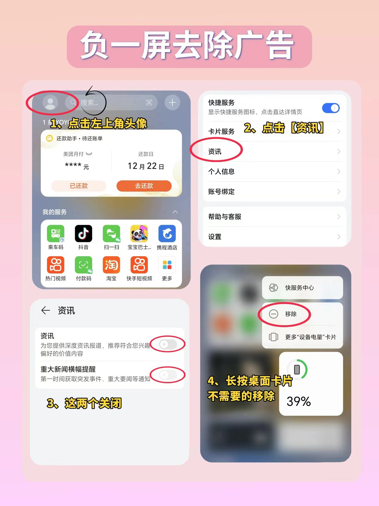 在【负一屏】点击左上角的头像进入【资讯】页面,将【资讯】和【重大新闻横幅提醒】的开关关闭,负一屏有多余的卡片还可以长按进行移除。