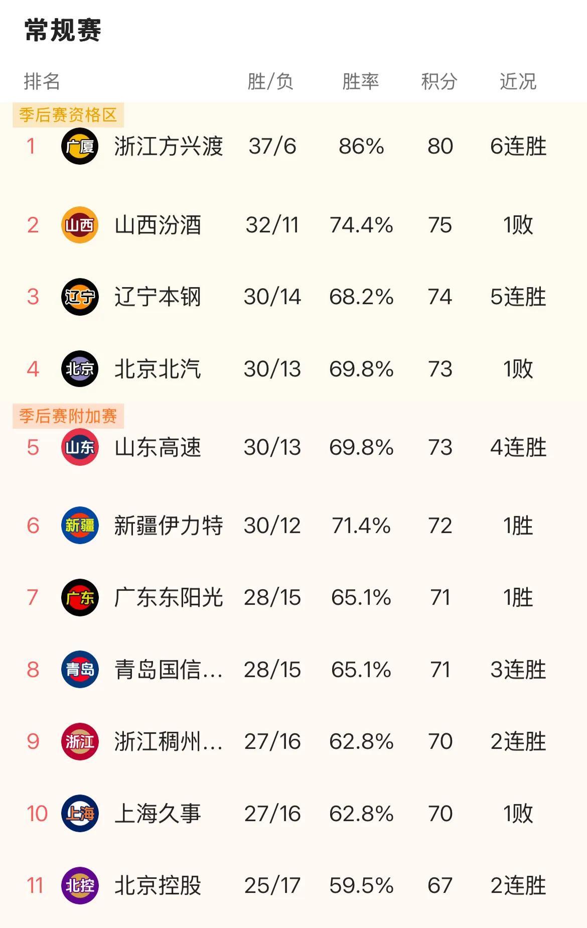 山东男篮同样以30胜13负的战绩紧随其后,排名第五。