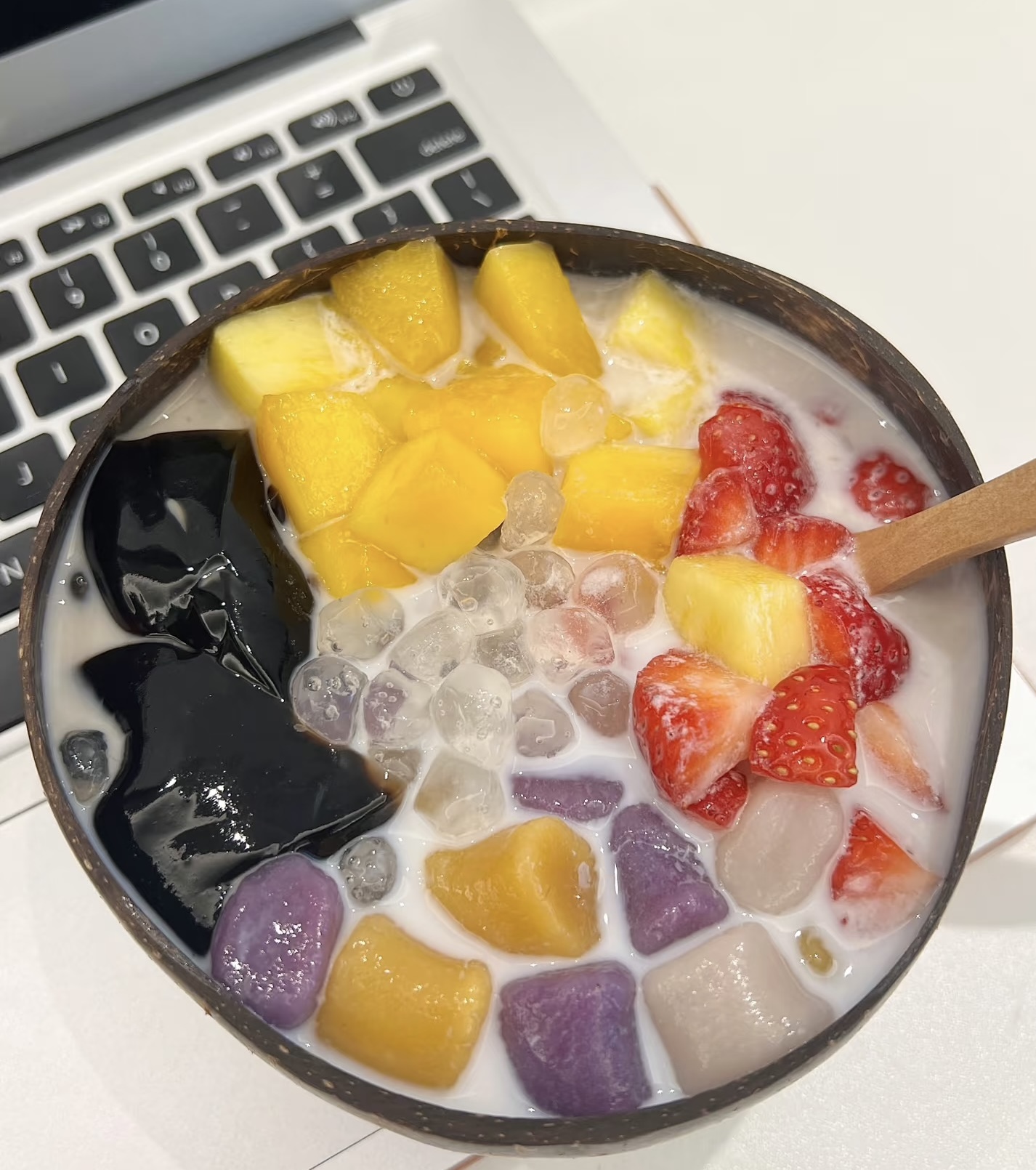 椰汁、雀巢鹰唛炼奶、草莓、凤梨、芒果、仙草、芋圆、脆啵啵