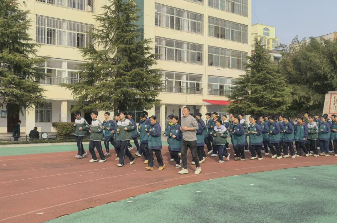 信阳市一中的塑胶跑道上,有这样一位老师:他身形挺拔、步伐坚定,每天总能在操场上看到他带领学生奔跑的身影。他一边领跑,一边回头喊着“调整呼吸,跟紧队伍”,身后的九年级学生们踩着他的步点,用脚步丈量成长的长度。他声音洪亮、目光温暖,在教室的讲台上又能化身为学生们信赖的班主任。他就是体育教师兼九年级班主任——赵磊。