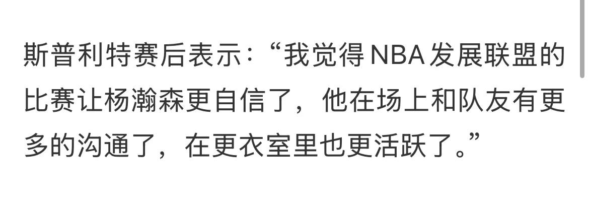 二是斯普利特表示发展联盟的比赛让杨瀚森更自信了!很显然主教练已经看到了杨瀚森的进步和融入,安排杨瀚森上场自然也是对杨瀚森进步的肯定!说起来教练的逻辑也非常简单,你训练的好、有进步,球队就给你机会!给你机会,你抓住了,就会有更多的机会!
