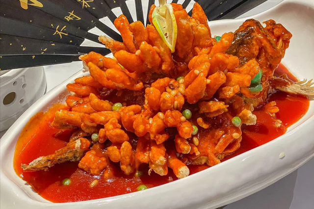 正宗松鼠桂鱼必须上桌时“吱吱”作响,模拟松鼠叫声,否则视为失败!