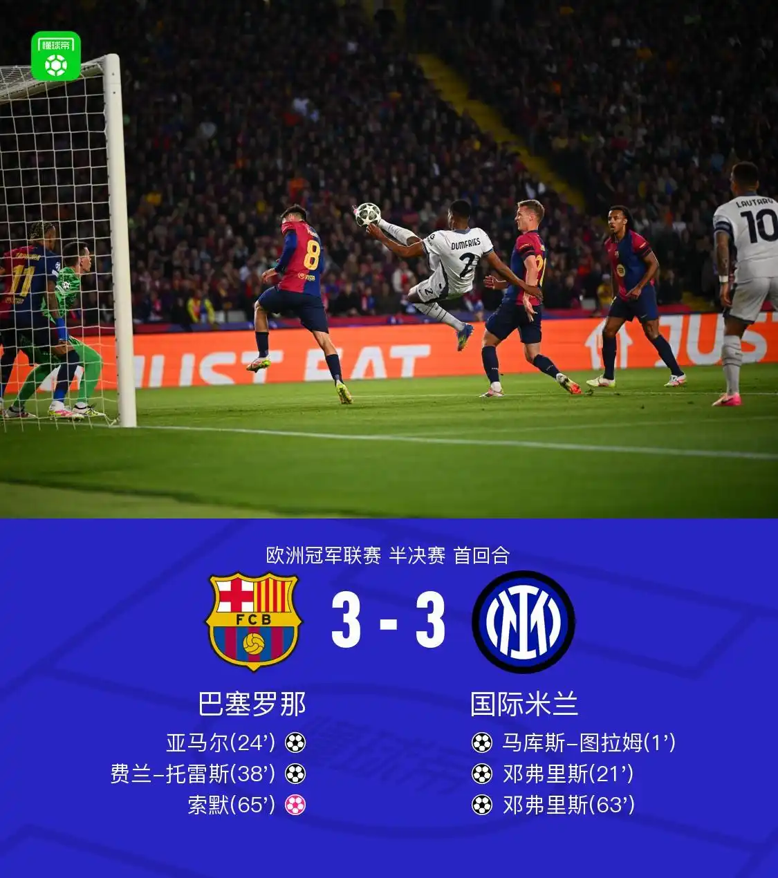 2025年5月1日凌晨3点17分,诺坎普球场的VAR操作室内,半自动越位系统生成的3D模型投射在屏幕上——姆希塔良的右脚尖距离巴萨最后一名防守球员阿劳霍仅差3厘米。这个精确到毫米级的判罚,让36岁的亚美尼亚老将错失绝杀,也将巴萨与国际米兰的欧冠半决赛首回合比分定格在3-3。