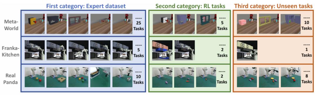 作者在仿真环境(MetaWorld, Franka Kitchen)和真实世界(Panda 机械臂)中进行了大量实验,验证了该方法的有效性。