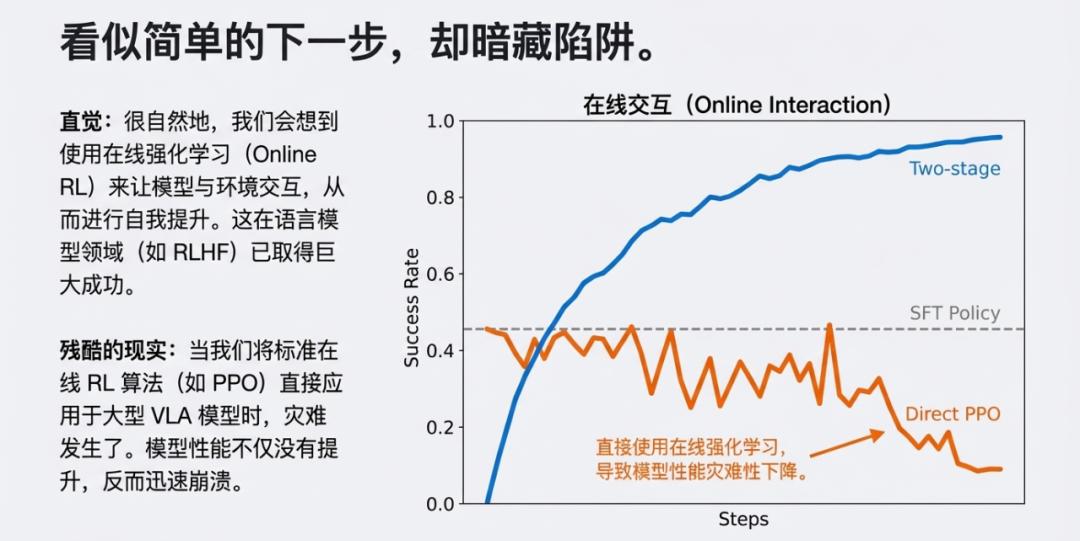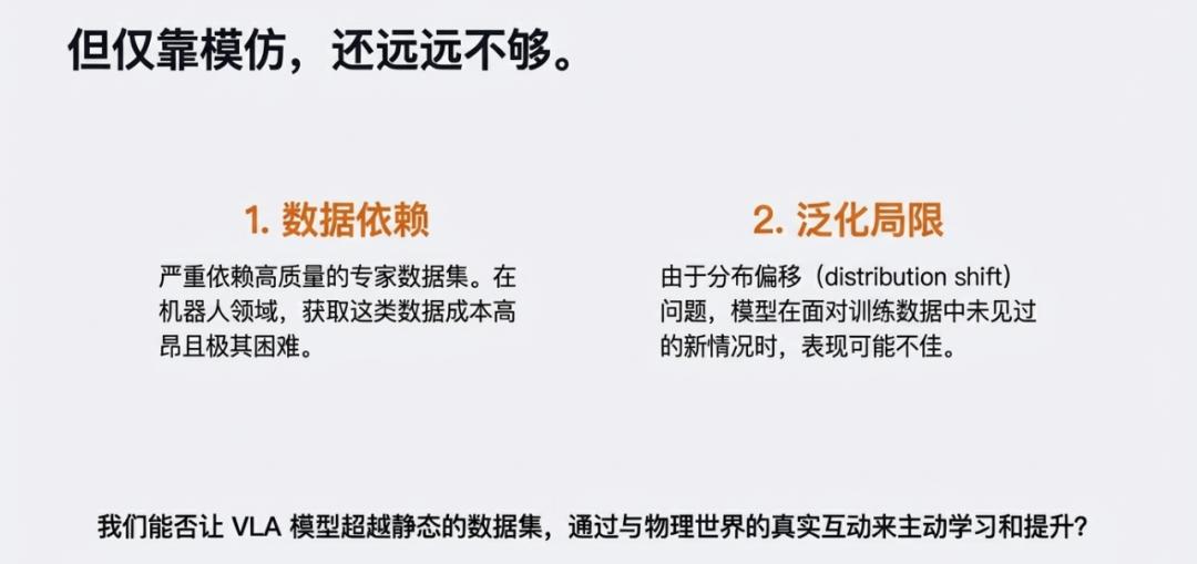 在具身智能(Embodied AI)领域,科学家们正在尝试将强大的视觉-语言模型(VLM)应用到机器人的底层控制中,这就是所谓的VLA模型。通常,这些模型是通过模仿人类专家的示范数据(监督微调,SFT)来学习的。