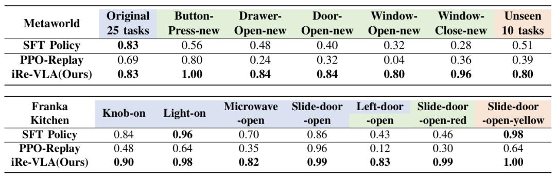 MetaWorld & Franka Kitchen:在这些基准测试中,iRe-VLA 不仅在原本学过的任务上表现更好(例如从 43% 提升到 83%),还能通过在线探索学会完全没见过的任务。