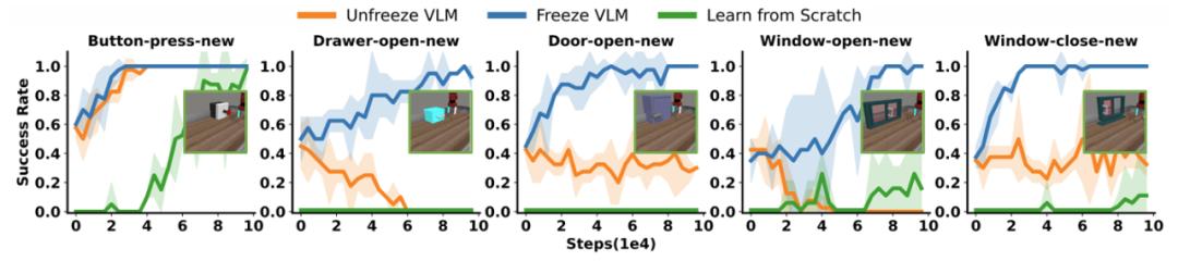 结果显示,如果不解冻 VLM,模型的性能提升会遇到瓶颈。这证明了在第二阶段解冻大模型参数是必要的,这样才能利用大模型深层的特征表示能力来彻底掌握复杂技能,并提升泛化性。