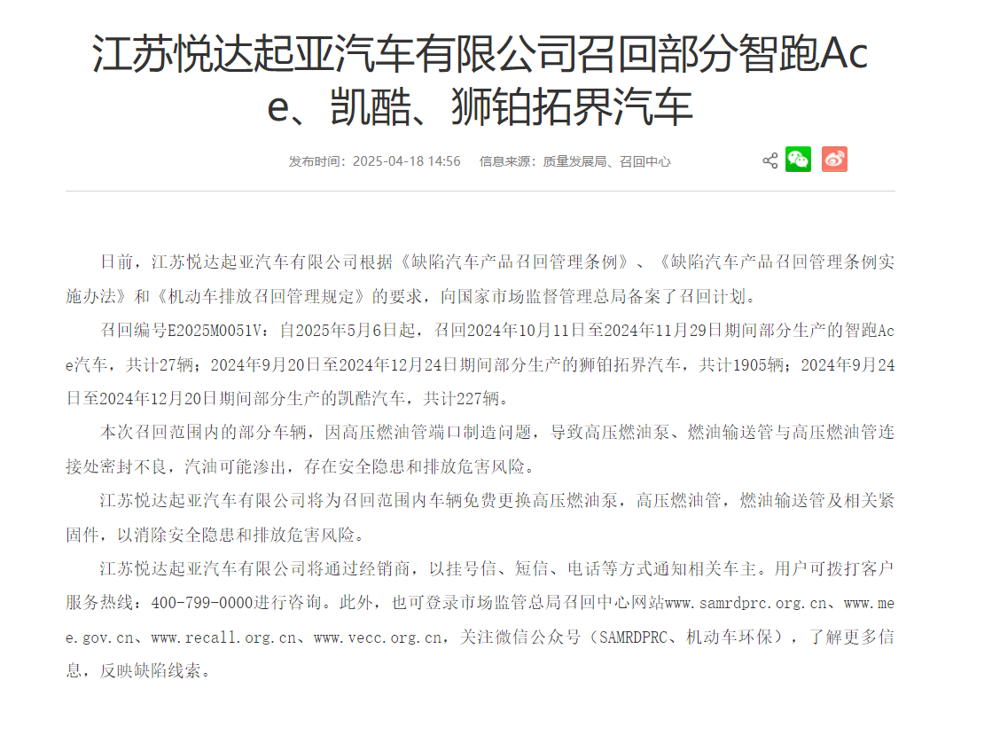注意了,起亚将在国内车市召回,涉及多款车型。国家市场监督管理总局消息显示,从2025年5月6日起,这家车企将对智跑Ace、狮铂拓界及凯酷三款车型共计2159辆实施召回,原因直指高压燃油管端口制造缺陷可能导致燃油渗漏。
