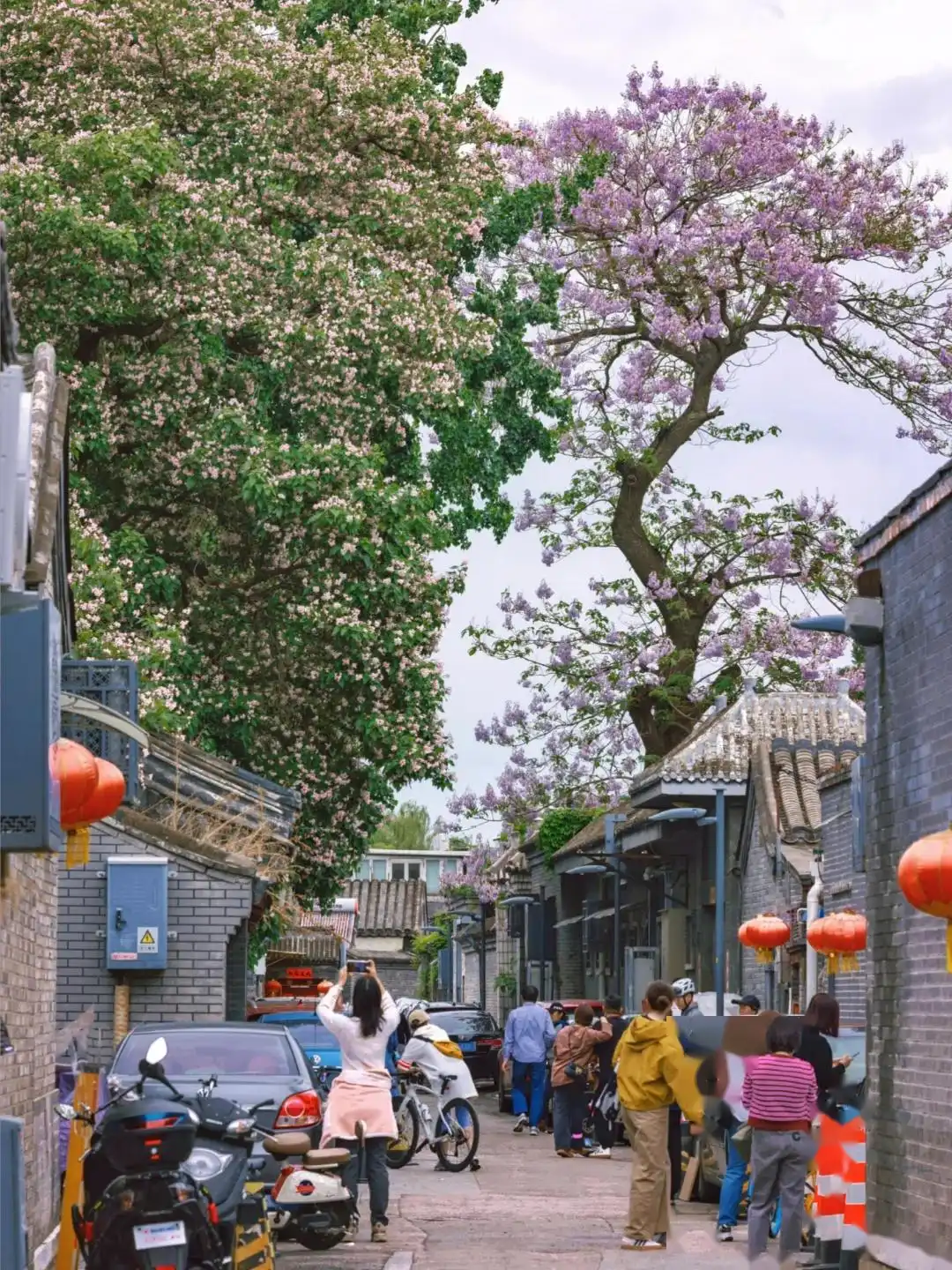 每年春天来这里拍照留念的游客很多,他们或单独,或结伴,或带着家人,大家都沉浸在春天的气息里。老北京有句话,“春来一枝红杏出墙来”,如今看来,这句话似乎要改成“春来一树泡桐满院香”了。