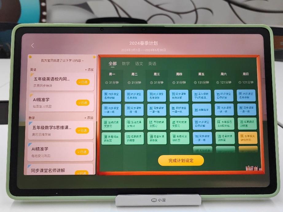小度学习机Z30设有“学习全过程实时诊断”与“量身定制学习计划”功能,跟随步骤指引,设定学期目标(想要提升的环节/科目)和孩子学习现状(在读年级/成绩水平)并选择对应教材后,小度老师即可精准识别孩子的学习薄弱点,为孩子规划好未来的学习路径——制定出一份详细的学习计划表。这份计划表为孩子制定好了每天的“一课一练”并标注好了完成所需要的时间,还可以根据孩子的学业压力情况进行添加/删改。