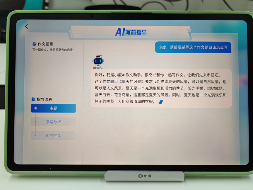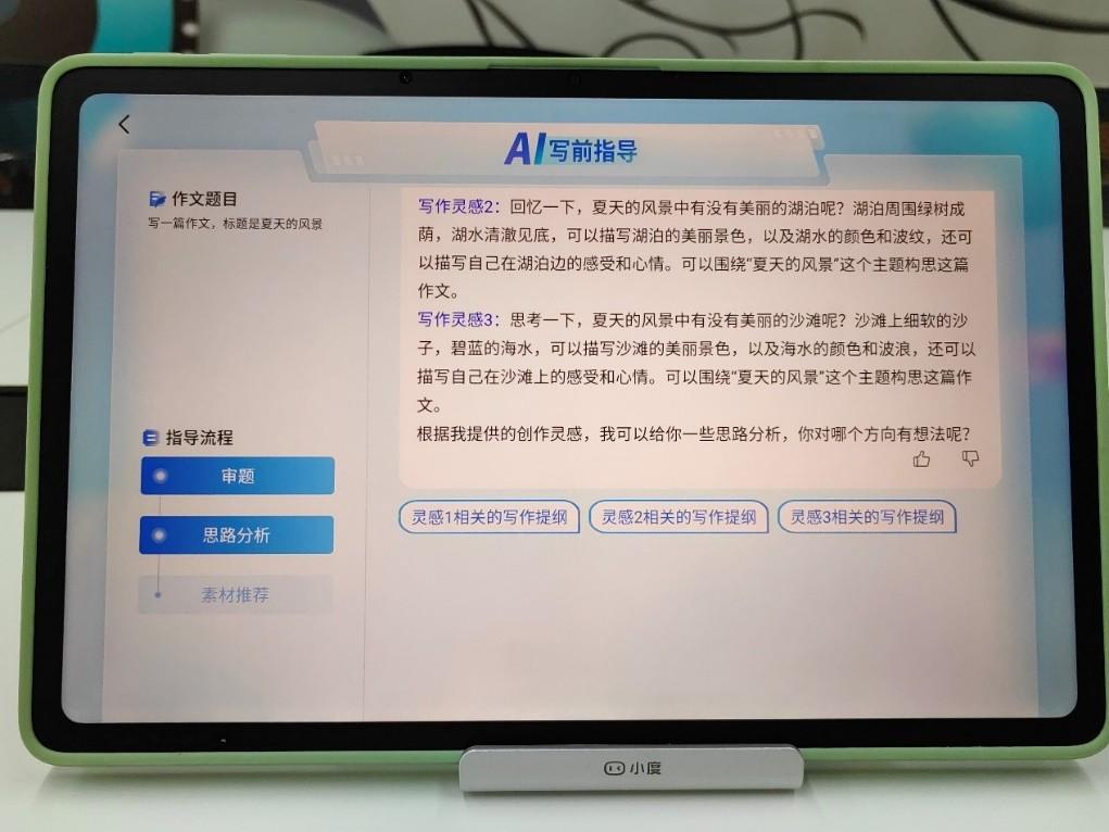 小度学习机Z30配备了全新升级的“AI作文老师”,首创“AI写前指导”功能,从分析作文题意,到思路引导,素材的推荐等,互动式启发,慢慢打开孩子的写作思路。