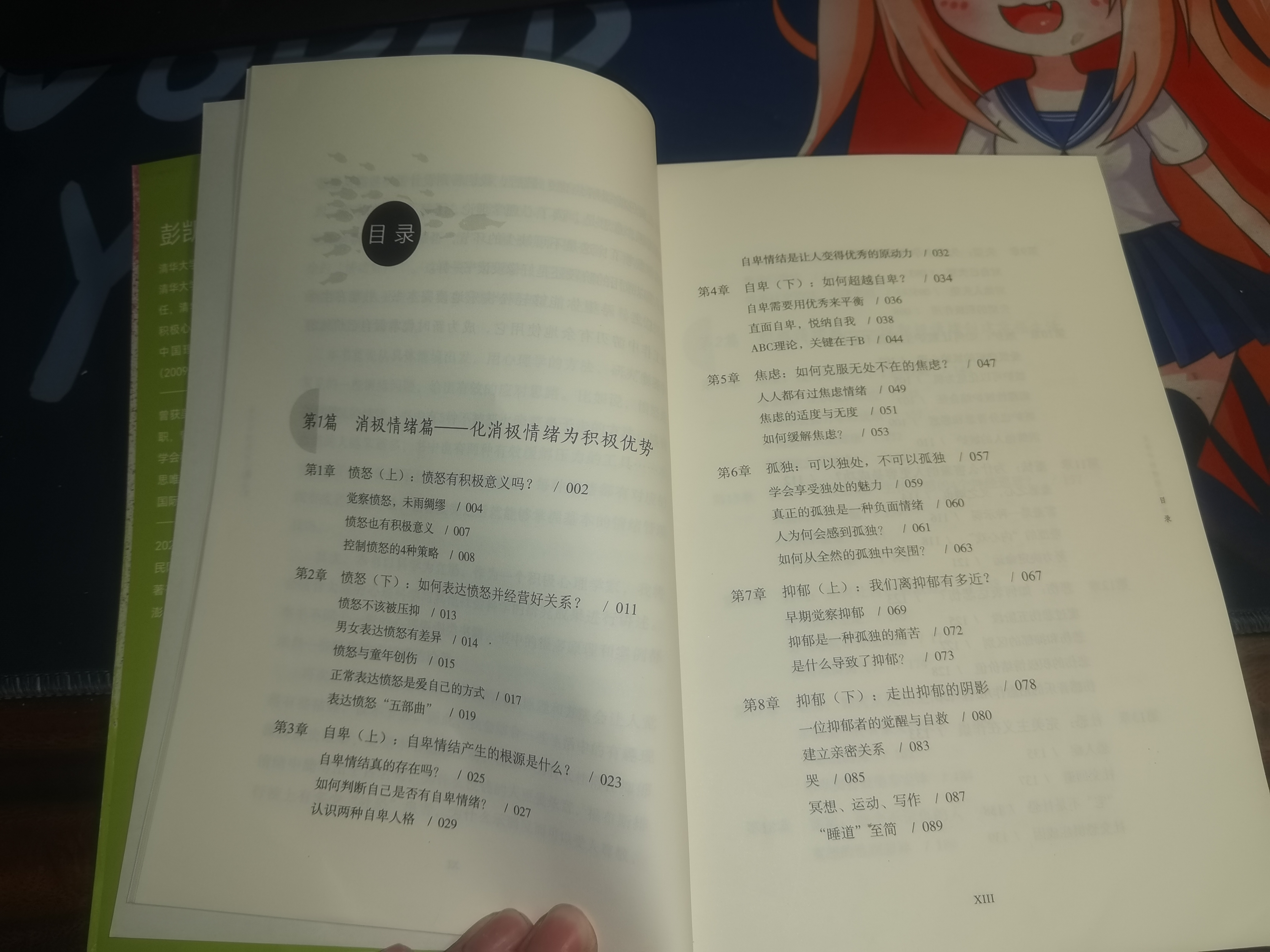 那么这本书好在哪里呢,有什么实用性的呢,作为刚读完的人,我简单介绍一下起个抛砖引玉的作用吧。该书分三个部分,第一部分是消极情绪篇,目的在于化消极情绪为积极优势。内容就丰富的多了,例如如何发泄愤怒情绪,如何让愤怒成为动力,还有如果将自卑 焦虑,甚至抑郁转化为正向情绪等等。