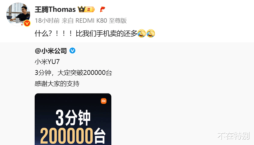 就连REDMI产品经理都直接承认,25.35万起的小米YU7比2599元的K80至尊版手机销量都还要多,销售额就更不用说了。