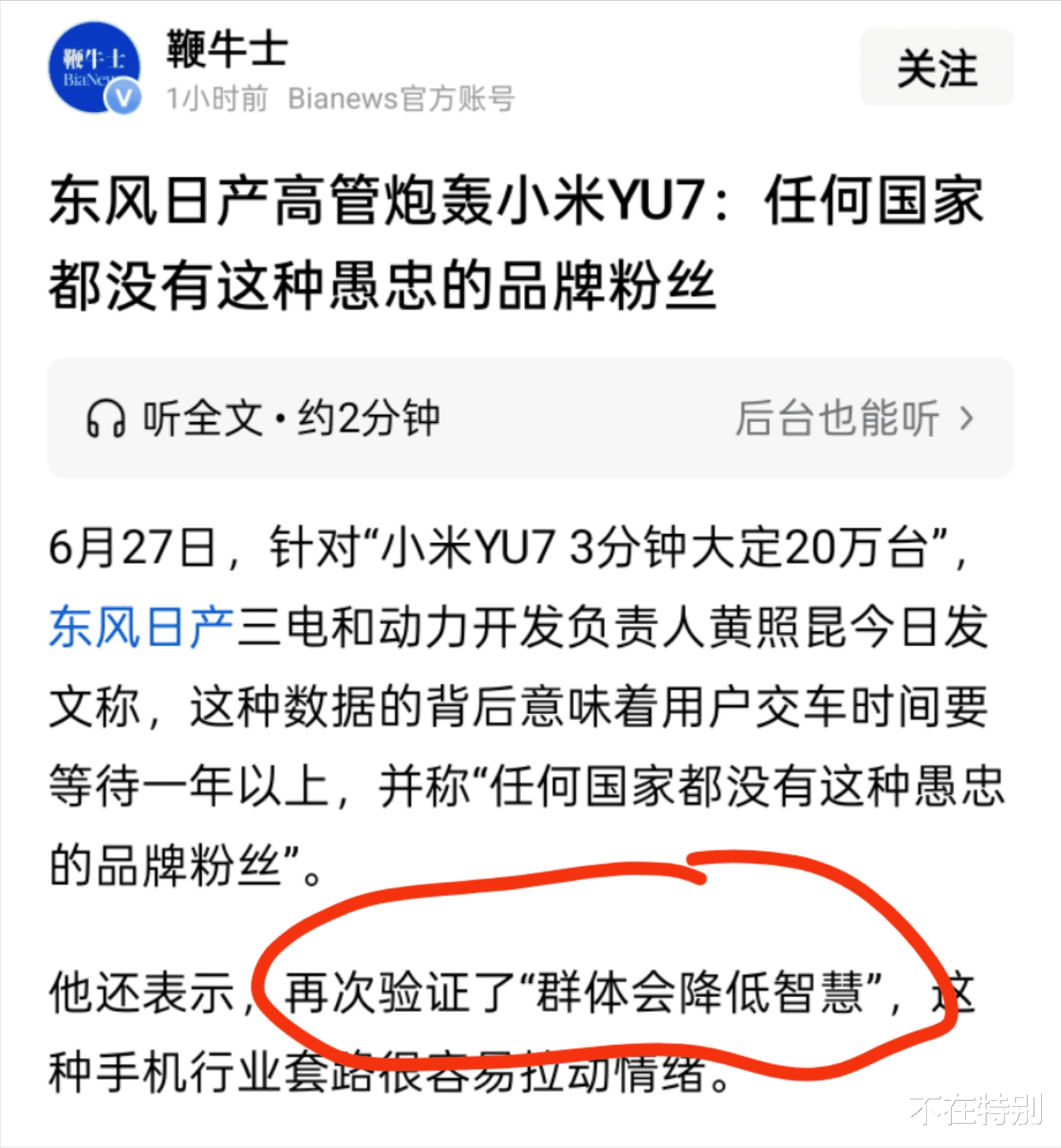 后面东风日产高管又冒出来炮轰小米YU7,说话也是很难听,都带有攻击性了,“愚忠的品牌粉丝”、“群体会降低智慧”,一个高管实属不该这样说话。并且在小米YU7发布会上,雷军还宣布了郑州日产是小米人车家全生态的首批合作伙伴。