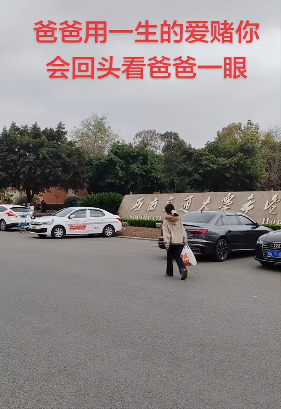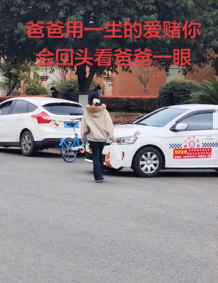 就像一位父亲送女儿去学校开学,本来应该是让人感慨的场景,这位父亲甚至配上这样一段催人泪下的话:爸爸用一生的爱赌你会回头看爸爸一眼。