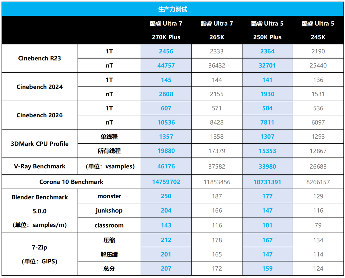 而在Cinebench系列测试中,酷睿Ultra 7 270K Plus相较265K的多线程性能提升幅度达到21%至25%,酷睿Ultra 5 250K Plus的提升则更为明显,达到26%至28%。在Blender Benchmark等实际渲染场景中,两款新品的领先幅度甚至扩展至33%至37%。对于需要高频次编译、渲染或3D建模的用户而言,这种提升具备明确的效率转化价值。