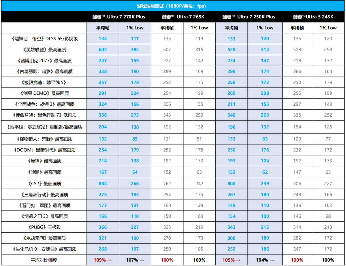 再配合英特尔二进制优化技术的引入,性能还有进一步挖掘空间。通过APO工具开启iBOT功能后,酷睿Ultra 7 270K Plus在支持的游戏与应用中平均帧率提升约7%,最高可达11%,酷睿Ultra 5 250K Plus也实现了约8%的性能增益。这种通过软件层面动态优化指令调度的方式,在不增加功耗的前提下实现了额外的性能释放,对追求极致帧率的玩家而言具备很高的实用价值。
