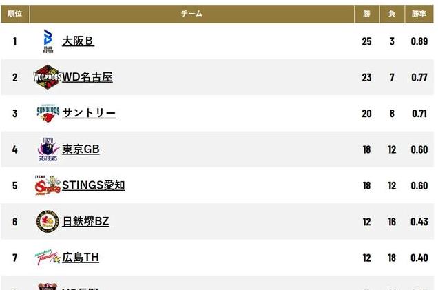目前日本男排SV联赛积分榜(前8名)排名如下【1】大阪布鲁顿25胜3负-胜率89%【2】名古屋狼犬23胜7负-胜率77%【3】三得利太阳鸟20胜8负 -胜率71%【4】东京大熊18胜12负-胜率60%【5】捷太格特蜂刺18胜12负-胜率60%【6】日铁堺12胜16负-胜率43%【7】广岛雷霆12胜18负-胜率40%【8】VC长野7胜21负-胜率25%。