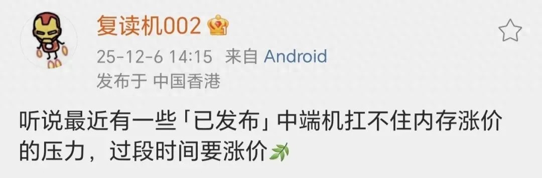 12月6日,知名博主@复读机002 在社交平台抛出重磅消息:“听说最近有一些「已发布」的中端机扛不住内存涨价压力,过段时间要涨价!”