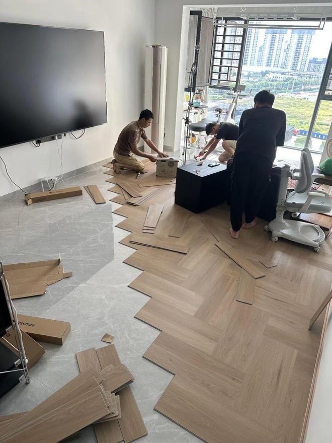改造过程倒也没有那么麻烦,选择6cm厚的SPC地板,可以直接铺在地砖上,门缝完全可以通过,不需要锯门底。