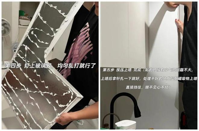 3、背面打上玻璃胶,再按压上墙,中间拼接缝打上防霉胶即可。